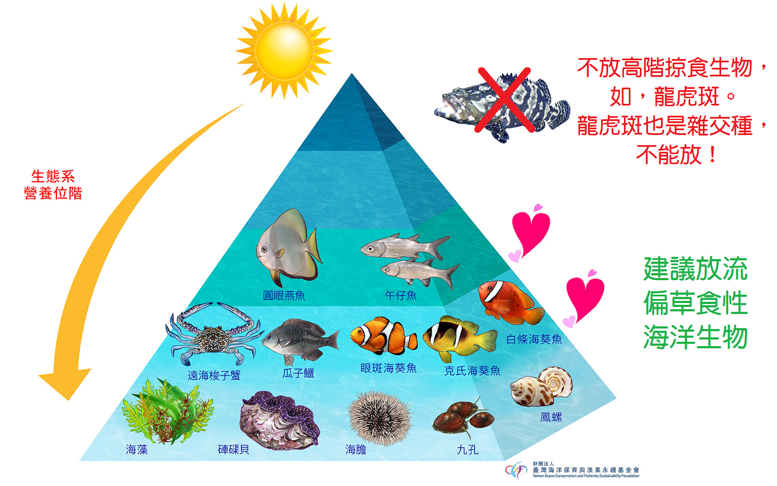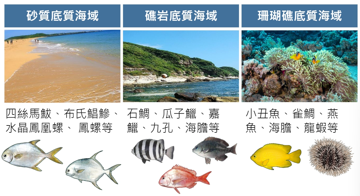 台灣的海岸環境多樣,包含砂岩、礁岩、珊瑚礁,型塑台灣沿近海域的生物多樣性。所以,不同的魚種都有自己適合的環境。進行放流的時候,除了考量海岸的類型外,也要注意該地點是否為要放生的魚種的原生環境,以避免對生態系造成破壞。