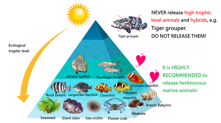 In terms of species selection, try to select native species of medium-low trophic level, such as abalone, hard clam, sea urchin, spiny lobster, largescale blackfish, sea bream, circular batfish, barred knifejaw, clownfish, etc., and do not release alien species and hybrids. Rather than domesticated adult fish, fishes released should be in the stage of fingerlings (baby fish) in considering their strong adaptability, so as to ensure that the fish can adapt well in the wild.